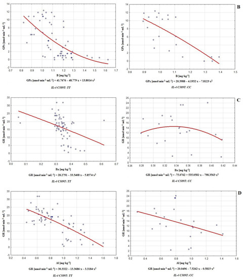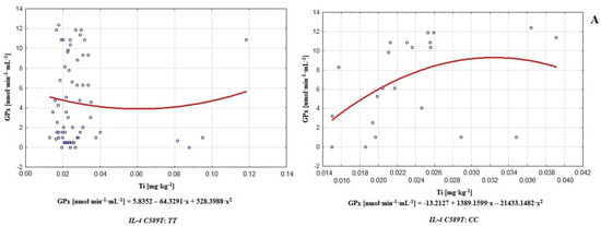 Correlations among glutathione peroxidase GPx and titanium Ti (A), glutathione peroxidase GPx and boron B (B), glutathione reductase GR and barium Ba (C), glutathione reductase GR and aluminum Al (D), glutathione reductase GR and boron B (E), malondialdehyde MDA and phosphorus P (F), malondialdehyde MDA and zinc Zn (G) regarding IL-4v.C589T (rs2243250) genotypes CC and TT.