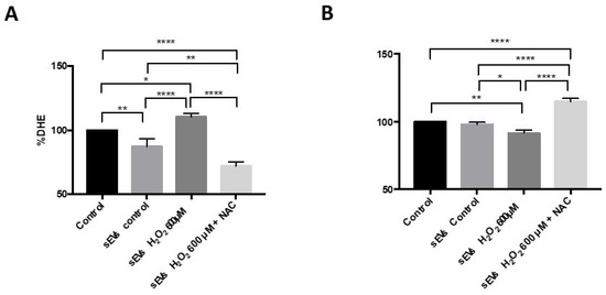 sEVs induced oxidative stress and affected cell viability. Superoxide anions were measured by DHE after sEV control (87.16 ± 6.23), sEV H2O2 600 µM (110.5 ± 2.61), and sEV H2O2 600 µM with N-acetylcysteine exposure (72.03 ± 6.61) (A). XTT assay was performed on the analyzed cell viability after sEV control (97.98 ± 1.58), sEV H2O2 600 µM (91.38 ± 2.43), and sEV H2O2 600 µM with N-acetylcysteine exposure (114.8 ± 2.31). (B). Values are expressed as percentage to control ± SEM (n = 4; DHE and n = 3–4; XTT). The p-value was calculated by ANOVA, and statistically significant differences were * p < 0.05, ** p < 0.01, and **** p < 0.0001.