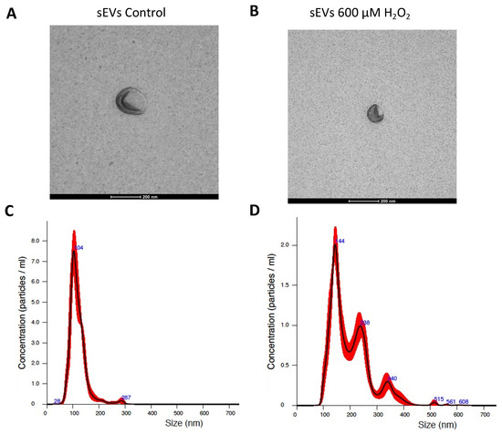 sEVs released by ARPE-19 cell characterization. sEVs released by control ARPE-19 cells (A) and 600 µM H2O2 ARPE-19 cells (B) were observed by electron microscopy and nanoparticle tracking analysis sEV control (C) and sEVs H2O2 600 µM (D) Scale bar: 200 nm.