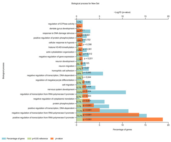 Networks and biological pathways regulated by the predicted targets were entered into the FUNRICH software (version 3.1.3) to perform the functional analysis. The functional enrichment analysis of miR-302a-3p showed 607 biological processes regulated by at least one of the 1019 mRNA target of miR-302a-3p. Among the top 20 related pathways, 1.3% of genes were related to GTPase activity, dentate gyrus development by 0.7%, and DNA damage response by 3% (Figure 3).