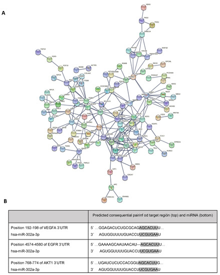 About 38 pathways related to miR-302a-3p mRNA targets are related to blood vessel formation. Using STRING, angiogenic and vasculogenic related processes were selected, and 213 mRNA predicted targets were found, which encode proteins involved in the regulation of angiogenic processes (Figure 4A). Among the most repeated mRNA targets related to vasculogenic processes are VEGFA, EGFR, and AKT1. In fact, in silico analysis showed that VEGFA, EGFR, and AKT1 mRNAs are predicted targets for miR-302a-3p (Figure 4B).