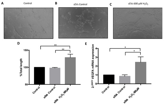 sEV-mediated vasculogenesis. HUVEC tube formation subject to different ARPE-19 cell culture media. Control medium (100 ± 0) (A), control sEVs (117.2 ± 1.79) (B), and sEV H2O2 600 µM (128.7 ± 9.52) (C). Scale bar: 100 µM. Total length (D) was calculated. mRNA VEGFA expression after 24 h of sEVs control (0.85 ± 0.16) and sEVs H2O2 600 µM (2.44 ± 0.6) exposure in ARPE-19 cells (E). Values are expressed as mean ± SEM (n = 3; Matrigel assay and n = 5; mRNA expression analysis). The p-value was obtained by ANOVA; * p < 0.05 and ** p < 0.01.