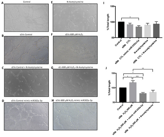 Angiogenesis was mediated by miR-302a-3p within sEVs. HUVEC tube formation subject to different sEVs released by ARPE-19 cell under different conditions. Control medium (100 ± 0) (A), sEVs released in control conditions (91,76 ± 4.5) (B), sEVs released in control conditions and N-acetylcysteine (93.44 ± 7.69) (C), sEVs released in control conditions with mimic miR-302a-3p (84.27 ± 4.15) (D), N-acetylcysteine (90.30 ± 5.61) (E), sEVs released in H2O2 600 µM conditions (118 ± 6.43) (F), sEVs released in H2O2 600 µM conditions and N-acetylcysteine (84.88 ± 6.79) (G), and sEVs released in H2O2 600 µM conditions with mimic miR-302a-3p (80.57 ± 3.52) (H). Total length (I,J) was calculated. Values are expressed as mean ± SEM (n = 3). The p-value was calculated by ANOVA; * p < 0.05, ** p < 0.01, and *** p < 0.001.