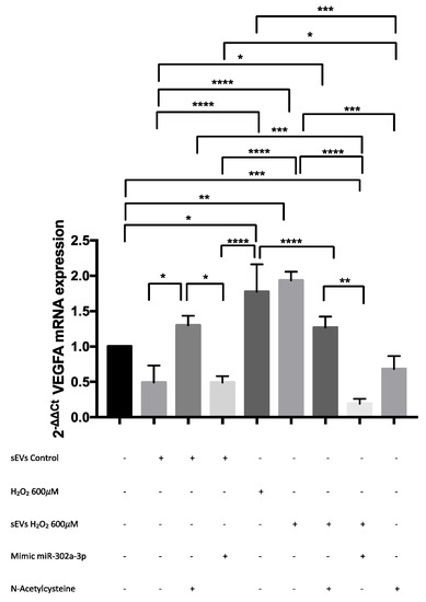 In silico analysis indicated miR-302a-3p as a VEGFA target. ARPE-19 VEGFA mRNA expression was determined by qRT-PCR (Figure 7). VEGFA mRNA was significantly overexpressed by both H2O2 sEVs and H2O2 exposure compared to control sEVs and the control. miR-302a-3p mimic exposure significantly decreased the H2O2-induced VEGFA mRNA expression under the control mRNA expression levels. The addition of NAC significantly reduced H2O2-induced VEGFA mRNA expression to control levels.