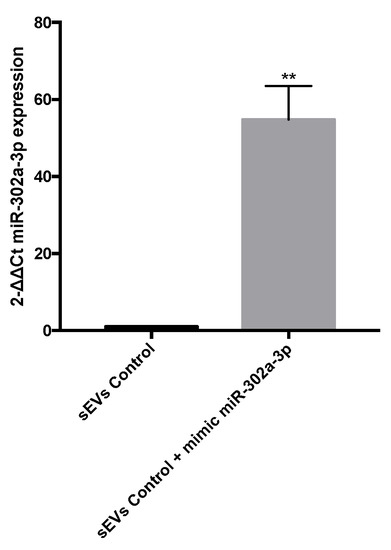 Finally, in order to demonstrate that miR-302a-3p mimic exposure is capable of affecting sEV cargo, we transfected ARPE-19 cells with miR-302a-3p mimic (see the Materials and Methods section), and sEVs were analyzed by qRT-PCR. Our findings strongly indicated that miR-302a-3p mimic transfection resulted in a significantly high miR-302a-3p expression levels on sEVs (Figure 8). This result supports the possibility of a direct targeting of miR-302a-3p on VEGF mRNA.