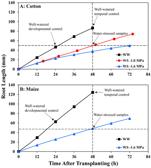 For cotton, similarly, a water stress-tolerant line in terms of primary root elongation was selected from a comparison of nine genotypes provided by the Regional Breeders Testing Network (Cotton Inc., Cary, NC, USA). Of the nine genotypes, AU90810 exhibited the greatest ability to maintain root elongation under severe stress. Nevertheless, inhibition of elongation was greater than in maize, with only 26% of the well-watered rate occurring at a water potential of −1.6 MPa (Figure 1A; Table S1).