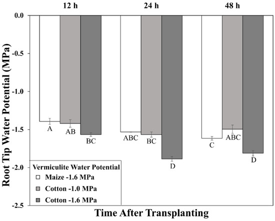 In maize, after transplanting to vermiculite at −1.6 MPa, the primary root tip water potential declined to a stable value of around −1.6 MPa by 24 h (Figure 2), in approximate equilibration with the medium and in agreement with previous results [41]. In association, root elongation was steady after 24 h under well-watered (2.6 mm h−1) and stressed (1.0 mm h−1) conditions (Figure 1B; Table S1).