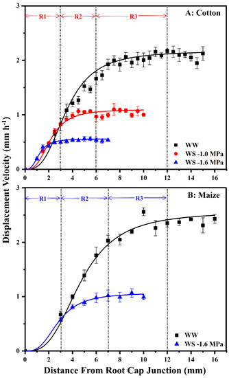 Displacement velocity profiles in the elongation zone of the primary root of cotton (A) and maize (B) seedlings 48 h after transplanting to well-watered (WW) or water-stressed (WS) conditions. In the water stress treatments, vermiculite water potentials were −1.0 MPa (cotton) and −1.6 MPa (cotton and maize). For each treatment, displacement velocity profiles were calculated for 4–5 individual roots from elongation rates and cell length profiles; values are the means ± SE. R1–3, as described in the text, are indicated for cotton and maize roots in the −1.0 MPa and −1.6 MPa treatments, respectively, which resulted in equivalent root tip water potentials in the two species (Figure 2). The spatial distribution of relative elongation rate is obtained from the derivative of displacement velocity with respect to position. The maize data are reproduced from Sharp et al. [26] with permission from Oxford University Press.