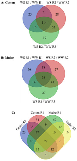 Samples were lyophilized, ground in liquid nitrogen, weighed, and sent to Metabolon Inc. (Durham, NC, USA) for unbiased global metabolomics profiling. The platform consisted of ultra-high performance liquid chromatography-tandem mass spectroscopy (cotton and maize) and gas chromatography-mass spectrometry (maize), as described by Evans et al. [28]. Samples were extracted in methanol containing recovery standards and prepared for analysis using an automated MicroLab STAR system (Hamilton Company, Reno, NV, USA), as described by Yobi et al. [29].