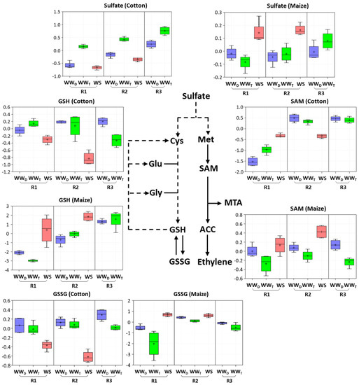 The metabolic changes that occurred in R1 of water-stressed cotton and maize roots, where cell elongation was maintained in both species, are shown in Table S2. Amino acid metabolism was substantially altered, with significant differences between cotton and maize as listed in Table 2 and Table 3. In particular, in glutathione and sulfur metabolism, cotton responded with significant decreases (to 0.7-fold) in both reduced (GSH) and oxidized (GSSG) glutathione (Table 3; box plots are shown in Figure 5), as well as similar reductions in 5-oxoproline and the derivatives S-methylglutathione (Table 1) and cysteineglutathione disulfide (Table S2). In striking contrast, R1 of stressed maize roots exhibited 41-fold and 6-fold increases in GSH and GSSG, respectively (Figure 5; Table 3). Maize also showed a significant increase in sulfate that was not evident in cotton (Figure 5; Table 3). Maize exhibited a reduction in 5-oxoproline, but an increase in S-methylglutathione (Table 1).