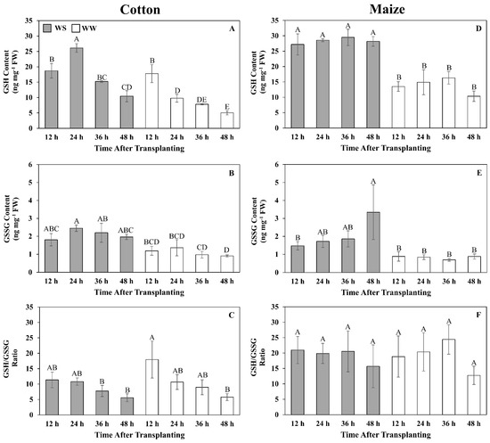 Time courses of reduced (GSH) (A,D) and oxidized (GSSG) (B,E) glutathione contents and their ratio (C,F) in the elongation zone of cotton (A–C) and maize (D–F) primary roots during 48 h after transplanting to water-stressed (WS, shaded bars) or well-watered (WW, open bars) conditions. In the water stress treatments, vermiculite water potentials were −1.0 MPa (cotton) and −1.6 MPa (maize), which resulted in equivalent root tip water potentials in the two species (Figure 2). The whole elongation zone (water-stressed cotton, 0–6 mm; water-stressed maize, 0–7 mm; well-watered cotton and maize, 0–12 mm) was collected. Data are the means ± SE (n = 3–6). ANOVA analyses compare the data at different time points across treatments within each species; different letters indicate significant differences (p < 0.05).