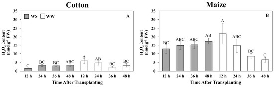 Although the quantitative glutathione measurements indicate that the cotton root elongation zone did exhibit a glutathione response following exposure to water stress, which was not revealed in the 48 h metabolomics single time-point assessment, it was clearly less in magnitude and duration than in maize. To investigate the impact of this differential response on the level of oxidative stress, the time course of H2O2 content was assayed under well-watered and water-stressed conditions (Figure 7). In cotton, H2O2 levels remained relatively low (6 nmol g−1 FW or less) in both treatments, with a significant difference apparent only at 12 h, when levels were lower in the stressed roots (Figure 7A). In well-watered maize roots, H2O2 levels were highest at 12 h (approximately 23 nmol g−1 FW) and then declined to 6 nmol g−1 FW after 48 h. In contrast, in response to water stress, H2O2 levels gradually increased to 17 nmol g−1 FW after 48 h (Figure 7B).