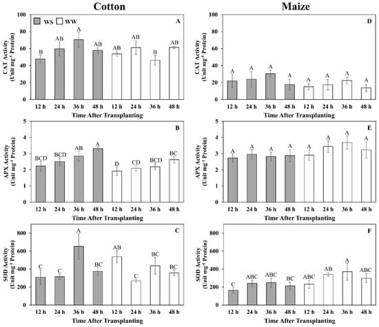 Time courses of catalase (CAT) (A,D), ascorbate peroxidase (APX) (B,E) and superoxide dismutase (SOD) (C,F) activities in the elongation zone of cotton (A–C) and maize (D–F) primary roots during 48 h after transplanting to water-stressed (WS, shaded bars) or well-watered (WW, open bars) conditions. In the water stress treatments, vermiculite water potentials were −1.0 MPa (cotton) and −1.6 MPa (maize), which resulted in equivalent root tip water potentials in the two species (Figure 2). The whole elongation zone was collected (see Figure 6 for dimensions). Data are the means ± SE (n = 4). ANOVA analyses compare the data at different time points across treatments within each species; different letters indicate significant differences (p < 0.05).