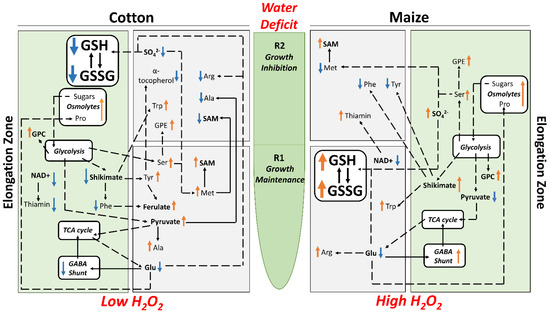 Summary of key changes in metabolite abundance in R1 and R2 and the whole elongation zone of cotton (left panels) and maize (right panels) primary roots growing under water deficit conditions with a focus on metabolites related to osmotic adjustment, antioxidative metabolism, sulfur metabolism and ultimately growth. Arrows adjacent to the metabolites indicate increases (orange) or decreases (blue) in abundance in water-stressed compared with well-watered roots.