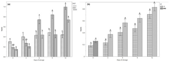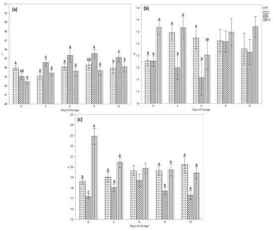 The redness decreased from day 0 to day 12 in the burgers from all the three experimental groups. A decrease was registered in the L group at the end of the storage time (Figure 1c), which is probably due to the easier oxidation of red oxymyoglobin to brownish metmyoglobin determined by the presence of reducing systems and on lipid oxidation, as also demonstrated in burgers from lamb meat [42]. Moreover, the a* value of the burgers at time point 0 was significantly higher in group LE compared to the other two groups, probably due the antioxidant effect of vitamin E that could have protected the heme pigments of meat from oxidation [43].