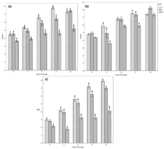 (a) Evolution of the mesophilic aerobic population, (b) psychrotrophic aerobic population and (c) lactic acid bacteria during the refrigerated storage of Marchigiana beef burgers in a modified atmosphere packaging. C = Control; L = Linseed; LE = Linseed plus vitamin E. Different letters indicate significant differences (A, B: p < 0.01) within each time point.