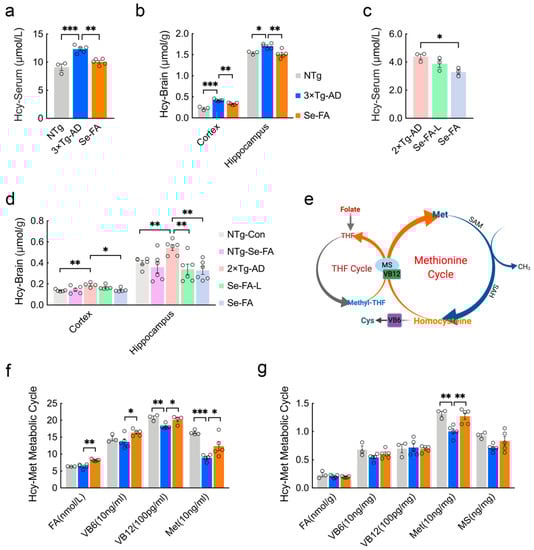 Early studies have found that Hcy elevation is a risk factor for AD, and a high Hcy level is a consequence of folic acid deficiency [24,25]. To assess the effect of Se-FA on Hcy levels in AD, we treated 3×Tg- and 2×Tg-AD mice with Se-FA for 3 months. It is well known that the cortex and hippocampus are the major regions affected by AD-related pathology. Consistent with the results of others [26], Hcy levels in the serum, cortex and hippocampus of AD mice were significantly increased compared with NTg mice. Se-FA administration significantly lowered the levels of Hcy, and a similar effect was shown in the hippocampus of 2×Tg-AD mice treated with low-dose Se-FA (Figure 1a–d). Intriguingly, no significant changes were observed in the brains of Se-FA-treated NTg mice (Figure 1d).
