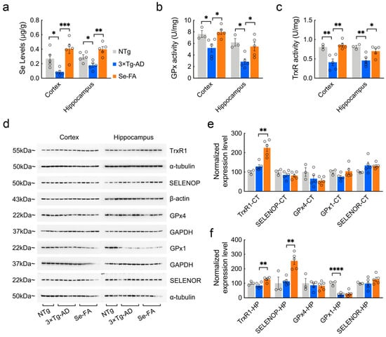 We previously demonstrated that Se levels in the cortex and hippocampus of AD mice were significantly lower than those of NTg mice [27]. Here, compared with NTg mice, 7-month-old 3×Tg-AD mice also showed a significant decrease in Se levels in the brain, and Se-FA administration significantly increased Se levels, which were even higher than those in NTg controls (Figure 2a). Se exerts its biological functions mainly through selenoproteins and selenoenzymes. Consistent with the Se levels, we observed reductions in the activity of GPx and TrxR (the two major selenoenzymes in the brain) in AD mice, and Se-FA significantly enhanced their activity in the cortex and hippocampus (Figure 2b,c).