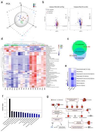 LC–MS untargeted metabolomics analysis reveals altered metabolites and metabolic pathways in the two paired comparisons of AD versus NTg and FS versus AD. (n = 6 mice) (a) The PCA score plots obtained in the NTg, AD and FS groups. (b) Volcano plot of metabolite alterations in the two paired comparisons: AD versus NTg and FS versus AD. Significantly different proteins (FDR < 0.05 and fold change >2) are colored red (upregulated) and blue (downregulated); others are colored gray. (c) Venn diagram with the number of differential metabolites in the two comparisons. (d) Clustering heatmap of shared differential metabolites in both comparison groups in AD vs. NTg and FS vs. AD. (e) Heatmap of normalized expression levels of metabolites involved in the process of phospholipid peroxidation. (f) Kyoto Encyclopedia of Genes and Genomes (KEGG) enrichment analysis of 50 shared differential metabolites. (g) The metabolic network of the significantly regulated metabolites and metabolic pathways.