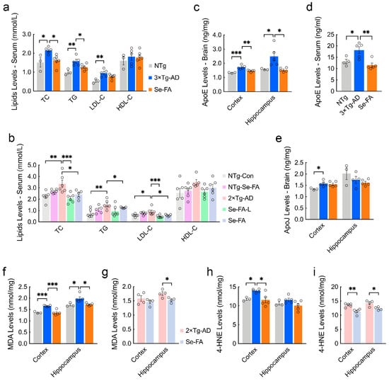 To determine the relationship between serum lipid levels and brain lipid metabolism, we tested the levels of apolipoprotein E (ApoE) and apolipoprotein J (ApoJ), which are crucial apolipoproteins present in the brain and are involved in binding and transporting blood lipids to the brain for metabolism and utilization [30]. ELISA analysis showed that ApoE levels were significantly elevated in the cortex, hippocampus and serum of AD mice, and significant reductions appeared in Se-FA-treated mice (Figure 4c,d). However, no significant changes in the levels of ApoJ were detected upon Se-FA administration, although its level also increased in the cortex of AD mice (Figure 4e). In addition to the disturbance of lipid metabolism, alterations in the lipid peroxidation process were also observed in the metabolomics data. As the two major metabolic end products of lipid peroxidation in the brain, the levels of malondialdehyde (MDA) and 4-hydroxynonenal (4-HNE) in 3×Tg- and 2×Tg-AD mice were significantly higher than those in NTg mice. Se-FA treatment significantly decreased MDA and 4-HNE levels in the brains of both 3×Tg-AD and 2×Tg-AD mice (Figure 4f–i). Combined, these data demonstrate that Se-FA reduces the levels of blood lipids and ApoE to regulate lipid metabolism and reverse lipid peroxidation in the brain.