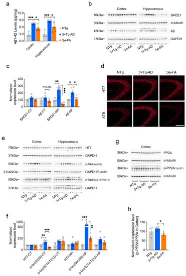 To evaluate whether the reversal effects of Se-FA administration on lipid metabolism affect AD-related pathology, we further examined Aβ and tau pathology in 3×Tg- and 2×Tg-AD mice upon Se-FA administration. AD mice showed significantly higher levels of Aβ1-42 in the cortex and hippocampus than NTg mice and were significantly decreased in Se-FA-treated AD mice (Figure 5a and Figure S4a). Consistent with the results of the Aβ ELISA, Se-FA also significantly reduced the elevated Aβ oligomer levels in the hippocampus of AD mice (Figure 5b,c). Aβ is produced by the APP cleavage pathway dominated by β-secretase (BACE1). Thus, we measured the level of BACE1 by immunoblot and found that it was significantly upregulated in the hippocampus of 3×Tg-AD mice. A significant decrease in BACE1 levels was detected in Se-FA-treated mice, indicating that Se-FA inhibits BACE1-mediated APP cleavage to reduce Aβ levels (Figure 5b,c).