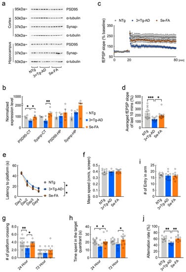Strong evidence has implicated synaptic failure as a direct contributor to cognitive decline in AD [31,32]. Here, we further analyzed the potential impacts of Se-FA on AD-related synaptic and cognitive deficits. Postsynaptic density protein-95 (PSD95) and synaptophysin are structural proteins located in the postsynaptic and presynaptic membranes, respectively. Immunoblot analysis showed that the levels of the two synaptic proteins were decreased, and that Se-FA significantly reversed the decrease in the cortex of AD mice (Figure 6a,b and Figure S4b,c). To better understand the alteration of synaptic plasticity, we examined long-term potentiation (LTP) in the Schaffer collateral (SC) pathway, with high-frequency stimulation, and found that the LTP impairment of 3×Tg-AD mice was ameliorated upon Se-FA administration (Figure 6c). Additionally, the averaged field excitatory postsynaptic potential (fEPSP) slope of Se-FA-treated mice significantly increased in the last 10 min compared with that of the controls (Figure 6d). Since the change in the last 10 min for LTP is regarded as late-phase LTP accompanied by gene transcription and new protein synthesis [33], these data revealed the restoration effects of Se-FA on synaptic plasticity.