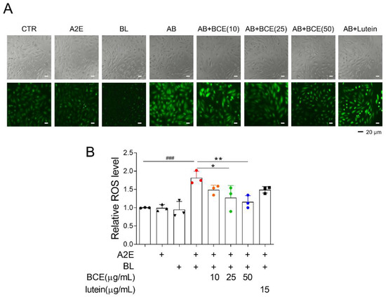 Antioxidant effects of BCE against the in vitro RPE damage model. (A,B) ARPE-19 cells were treated with A2E three times at 48 h intervals, and 24 h after the last treatment, BCE (10–50 μg/mL) or lutein (15 μg/mL) was treated twice at 24 h intervals. After 30 min of BL irradiation, the cells were recovered for 24 h. Cells were treated with DCF-DA (10 μM) for 10 min in serum-free medium. After washing with 1 × PBS twice, the cells were monitored using JuLI™ smart fluorescent cell analyzer. The relative ROS level was quantified using Image J. The results are presented as the mean ± standard deviation of three independent experiments (n = 3). ### p < 0.01 vs. normal group, * p < 0.05, ** p < 0.01 vs. A2E + BL.