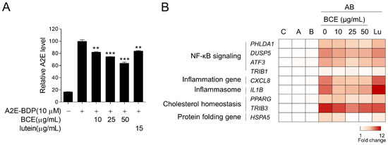 Next, we examined the effect of BCE on A2E accumulation in the RPE cells. ARPE-19 cells were pretreated with BCE for 24 h before treatment with fluorescence-labeled A2E (A2E-BDP). BCE treatment inhibited the accumulation of A2E in ARPE-19 cells in a dose-dependent manner. Lutein also significantly inhibited A2E accumulation (Figure 3A). A2E-laden ARPE-19 cells have been reported to show changes in the expression of several genes when exposed to BL. As BCE inhibited the accumulation of A2E in ARPE-19 cells, it was thought to affect various downstream gene expression pathways induced by BL. We used RT-qPCR to confirm whether BCE had any effect on these genes. The expression of genes related to NF-κB signaling, inflammation, inflammasome, cholesterol homeostasis, and protein folding was greatly increased by A2E and BL. BCE and lutein significantly downregulated the expression of genes induced by A2E and BL in ARPE-19 cells (Figure 3B and Supplementary Figures S1–S4). These results suggest that BCE protects cells from phototoxicity by inhibiting the accumulation of A2E in RPE cells, thereby blocking the activation of various sub-cytophysiological pathways induced by the photooxidation of A2E.