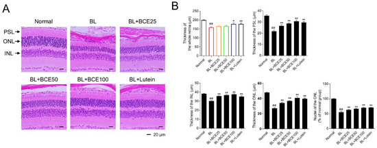 Protective effects of BCE on BL-induced retinal degeneration. (A) H&E staining for the evaluation of histological changes. Sections between 100 and 200 μm from the optic nerve of both eyes were observed. (B) Measurement of the whole retina, photoreceptor segment layer (PSL), outer nuclear layer (ONL), inner nuclear layer (INL) thickness, and number of nuclei in ONL. The results are presented as the mean ± standard error of the means (n = 10). ## p < 0.01 vs. normal group, * p < 0.05, ** p < 0.01 vs. BL group.