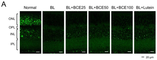 To examine whether BCE could alleviate the ocular lesions caused by BL irradiation, BCE was orally administered to a BL-induced retinal damage mouse model for 5 weeks. Ophthalmological examination was performed using a fundus camera (Table 1). Mice with lesions of retinal pigmentation, retinal hyperemia, and drusen were not observed in the normal group. In contrast, in the group exposed to BL, there were six and five mice with lesions in the right and left eyes, respectively. In the BCE-treated group, a dose-dependent decrease in the number of subjects with lesions of retinal pigmentation, retinal hyperemia, and drusen was observed. These data suggest that BCE ameliorates ocular lesions caused by BL irradiation.