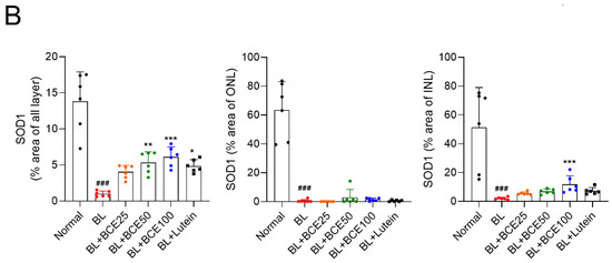 To determine the effect of BCE on antioxidant activity in mice, SOD1 expression was analyzed by IHC (Figure 5A). A 2-week exposure to BL significantly (p < 0.001) reduced SOD1 expression level in the retina compared to that in the retina of the normal group. However, BCE administration in the BL-exposed group rescued SOD1 expression (p < 0.001) in a dose-dependent manner (Figure 5B). These data suggest that BCE has a positive effect on antioxidant activity.