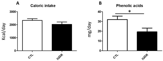 Caloric and phenolic alcohol (Tyrosol and Hydroxytyrosol) daily intake in control (CTL) vs. intrauterine growth restriction (IUGR) in pregnant women. (A). Conserved trend of caloric intake between CTL and IUGR pregnant women. (B). The daily intake of phenolic alcohols (tyrosol and HXT) is significative lower in IUGR when compared to CTL pregnant women. Results are expressed as means and standard error of the mean (SEM) (* p < 0.05).