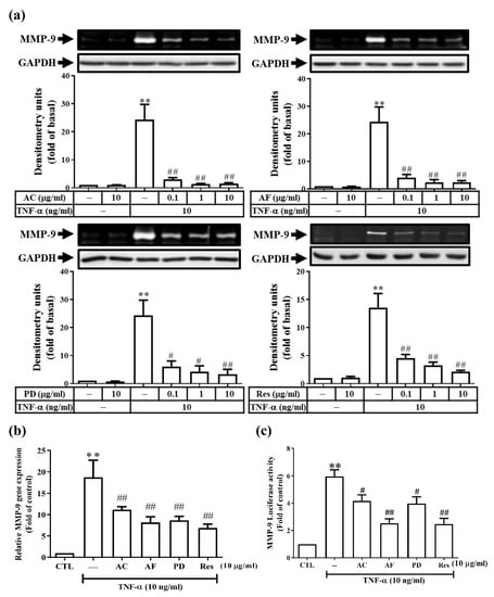 The following supporting information can be downloaded at: https://www.mdpi.com/article/10.3390/antiox11050835/s1, Supplementary Figure S1: The effect of AC, AF, PD or Res on cell viability; Supplementary Figure S2: TNF-α induced pro-MMP-9 protein expression in a time- and dose-dependent manner; Supplementary Figure S3: TNF-α induced ROS generation in a time-dependent manner.