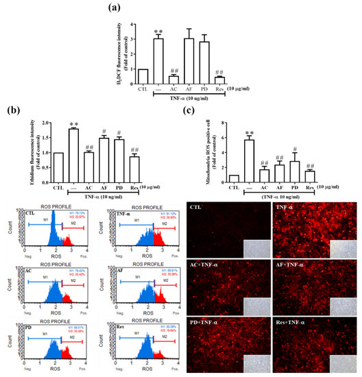 Antioxidant ability of AC, AF, Res, and PD in cells. (a) H2DCFDA (4 µM) was added to starved cells at 37 °C for 30 min, and cells were pre-treated with Res, AC, AF, and PD (10 μg/mL), cultured for 2 h, and then stimulated with TNF-α (10 ng/mL) for 6 h. Cell lysates were collected and the H2DCF fluorescence values were read on a SpectraMax i3 microplate reader (excitation at 485 nm, emission detection at 530 nm); n = 4–8. (b) After the same treatment as that described in (a), cells were harvested (1 × 106 cells/mL), free radicals were stained with DHE, and a Muse® Cell Analyzer was used for analysis; n = 3–4. (c) Cells seeded on glass slides were treated as in (a), and 5 μM MitoSOX™ Red reagent was added in the dark for 1 h at 37 °C. A fluorescence microscope was used to photograph the distribution of free radicals in the cells; n = 4–7. The results are presented as the mean ± SD and were analyzed using one-way ANOVA followed by Dunnett’s post hoc test. ** p < 0.01, compared with the untreated group. # p < 0.05, ## p < 0.01, compared with the TNF-α treatment group.