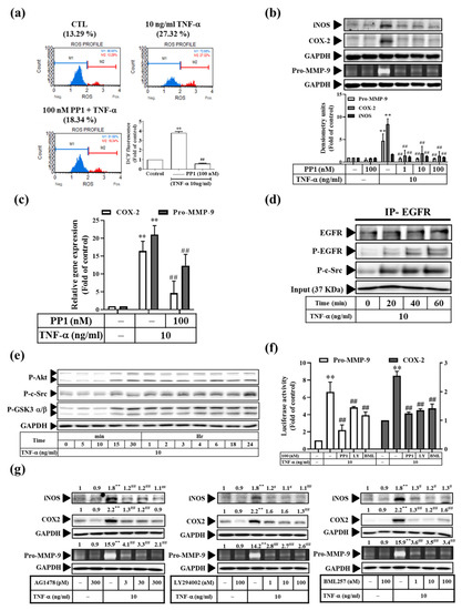 The c-Src/EGFR/PI3K/Akt/GSK3α/β pathway in TNF-α-induced COX-2 and pro-MMP-9 expression. (a) Cells were pre-treated with various concentrations of PP1, followed by TNF-α treatment for 6 h, collection of cells (1 × 106 cells/mL), staining of free radicals with DHE, and analysis using a Muse® Cell Analyzer. (b,g) Cells were pre-treated with various concentrations of (b) PP1 and (g) AG1478, LY294002, or BML257, followed by TNF-α treatment for 24 h (for COX-2 and iNOS) or 48 h (for MMP-9). MMP-9 enzyme activity was observed by gelatin zymography, and COX-2 and iNOS expression was detected by Western blotting. (c) Real-time PCR was used to analyze the MMP-9 and COX-2 mRNA transcripts. (d,e) After stimulation with TNF-α for various times, (d) the whole-cell lysate (input, 1 mg) was reacted with the anti-EGFR antibody. After co-immunoprecipitation, Western blotting was used with anti-EGFR, anti-P-EGFR, or anti-P-c-Src antibodies. (e) Western blotting was used to analyze the P-c-Src, P-Akt, and P-Gskα/β antibodies. (f) Cells were pre-treated with PP1, LY294002, and BML257, followed by TNF-α treatment. Luciferase assay was used to analyze the MMP-9 and COX-2 promoter activity. The results are presented as the mean ± SD from 4–6 experiments and analyzed using one-way ANOVA followed by Dunnett’s post hoc test. ** p < 0.01, compared with the untreated group. # p < 0.05, ## p < 0.01, compared with the TNF-α treatment group.