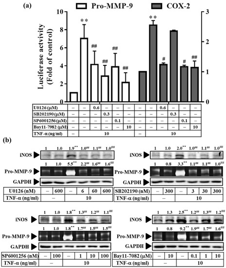 Involvement of MAPKs and NF-κB in TNF-α-induced, pro-MMP-9 expression. Cells were pre-treated with U0126, SB202190, SP600125, or Bay11-7082, followed by TNF-α treatment for 24 h (a) or 48 h (b). (a) Luciferase assay was used to analyze the MMP-9 and COX-2 promoter activity. (b) MMP-9 enzyme activity was observed by gelatin zymography, and Western blotting was used to analyze the expression of GAPDH (as a loading control). The results are presented as the mean ± SD from 4–6 experiments and analyzed using one-way ANOVA followed by Dunnett’s post hoc test. ** p < 0.01, compared with the untreated group. # p < 0.05, ## p < 0.01, compared with the TNF-α treatment group.