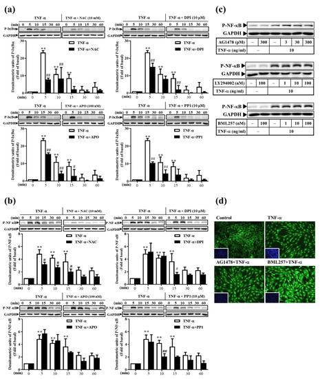 Our previous study concluded that the activation of NF-κB induced by TNF-α is not related to MAPKs [11]. Therefore, we aimed to identify the upstream molecules that are involved in activating the induction of NF-κB by TNF-α. The pretreatment of cells with inhibitors related to the ROS and EGFR pathways was followed by a challenge with TNF-α. As shown in Figure 8a,b, NAC, DPI, APO, or PP1 attenuated TNF-α-induced IκBα and NF-κB phosphorylation at various time points. These inhibitory results were not observed after AG1478, LY294002, or BML257 treatment, as determined by Western blotting (Figure 8c) or immunofluorescence staining (Figure 8d). These findings indicate that the TNF-α-induced classical NF-κB activation occurs via ROS, rather than via the EGFR pathway, in RMCs.