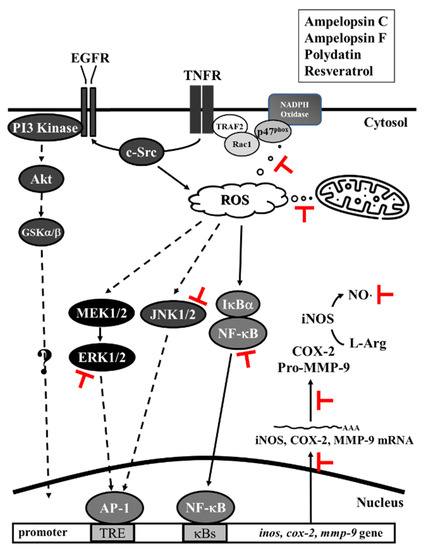 We demonstrate that TNF-α directly induced the expression of inflammatory proteins via the association between the TNFR and Rac1 and p47phox via the activation of the NAPDH oxidase-dependent MAPK and NF-κB pathways or via the alternative transactivation of the c-Src-dependent EGFR/PI3K/Akt pathway. The anti-inflammatory effects of the Res derivatives were exerted via the inhibition of the ROS derived from mitochondria and NADPH oxidase and the RNS derived from iNOS as well as the activation of the ERK1/2, JNK1/2, and NF-κB pathways (Figure 9). Overall, the results of this study promote the understanding of the various activities of Res derivatives from VT root extracts in Taiwan and their pharmacological mechanisms.