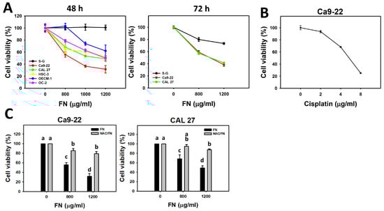 Fucoidan (FN) decreases the cell viability of oral cancer cells but not non-malignant cells. (A) MTS assay. After exposure to fucoidan (control, 800, 1000, and 1200 μg/mL) for 48 and 72 h, an MTS kit was chosen to determine the cell viability of oral cancer (Ca9-22, CAL 27, OECM-1, HSC-3, and OC-2) and non-malignant oral cells (S–G). (B) Cisplatin was a positive control for oral cancer cells (Ca9-22) following 24 h treatment. (C) The effect of oxidative stress on the cell viability of oral cancer cells following fucoidan treatment. After NAC (10 mM, 1 h) preincubation or not, cells were post-treated with control and fucoidan (0, 800, and 1200 μg/mL) with NAC co-treatment (10 mM) for 48 h. NAC/fucoidan (NAC/FN) represents pretreatment with NAC and post-treatment with FN. Data = mean ± SD (n = 3 experiments). Data of the same cells with non-overlapping letters reveal significant differences (p < 0.05). In the example of Figure 1B (Ca9-22 cells), FN at 0, 800, and 1200 μg/mL labeled with “a, c, and d” has significant results because the letters do not overlap. FN and NAC/FN of Ca9-22 cells at 800 or 1200 μg/mL labeled with “c and b” or “d and b” have significant results.