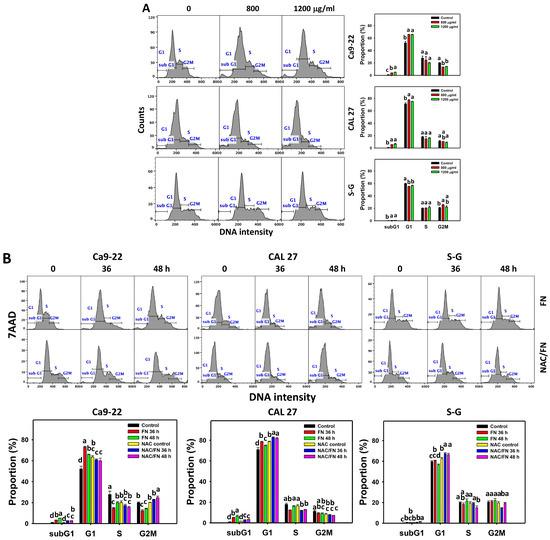 Fucoidan increases subG1 populations of oral cancer cells but not non-malignant cells. (A) Cell cycle distribution and statistical analysis. Oral cancer (Ca9-22 and CAL 27) and non-malignant oral cells (S–G) were treated with fucoidan (control, 800 (FN 800), and 1200 (FN 1200) μg/mL) for 0 and 48 h. (B) The effect of oxidative stress on the cell cycle change of fucoidan-exposed oral cancer cells. After NAC (10 mM, 1 h) preincubation or not, cells were treated with fucoidan (1200 μg/mL) with NAC co-treatment (10 mM) for 0, 36, and 48 h. NAC/fucoidan (NAC/FN) represents pretreatment with NAC and post-treatment with FN. Data = mean ± SD (n = 3 experiments). Data with non-overlapping letters reveal significant differences for each phase (p < 0.05). In the example of Figure 2A (subG1 phase of Ca9-22 cells), FN at 0, 800, and 1200 μg/mL labeled with “d, b, and a” has significant results because the letters do not overlap. In the example of Figure 2B (G1 phase of Ca9-22 cells), control, FN 36 h, and FN 48 h labeled with “d, a, and b” have significant results because the letters do not overlap. In the example of Figure 2B (G2/M phase of Ca9-22 cells), FN 48 h and NAC/FN 48 h labeled with “c and a” have significant results. The positive control of G2/M arrest of the cell cycle is provided in Supplementary Figure S5.