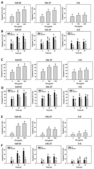 Fucoidan drives Cas 3, 8, and 9 signaling in oral cancer cells. Summary histograms of the flow cytometry results are presented. The individual density plots are presented in Supplementary Figure S1. (A,C,E) Cas 3, 8, and 9 statistical analysis. Oral cancer (Ca9-22 and CAL 27) and non-malignant cells (S–G) were treated with fucoidan (control, 800, and 1200 μg/mL) for 0 and 48 h. (+) indicates a high level of Cas 3, 8, and 9. (B,D,F) The effect of oxidative stress on Cas 3, 8, and 9 activations of fucoidan-incubated oral cancer cells. After NAC preincubation or not, cells were treated with fucoidan (1200 μg/mL) with NAC co-treatment (10 mM) for 0, 36, and 48 h. NAC/fucoidan (NAC/FN) represents the pretreatment with NAC and post-treatment with FN. Data = mean ± SD (n = 3 experiments). Data with non-overlapping letters reveal significant differences (p < 0.05). In the example of Figure 4B (Ca9-22 cells), FN at 36 and 48 h labeled with “a” has significant results compared with that at 0 h labeled with “bc”, because the letters do not overlap. FN and NAC/FN at 36 and 48 h labeled with “a and bc” and “a and b” have significant results. In contrast, FN at 36 and 48 h labeled with “a” has nonsignificant results because the letters overlap. e is not appeared for statistic analysis in the example.