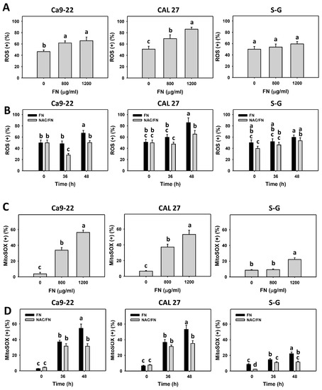 Fucoidan drives ROS and MitoSOX generation in oral cancer cells. Summary histograms of the flow cytometry results are presented. The individual density plots are presented in Supplementary Figure S2. (A,C) ROS and MitoSOX statistical analyses. Oral cancer (Ca9-22 and CAL 27) and non-malignant cells (S–G) were treated with fucoidan (control, 800, and 1200 μg/mL) for 0 and 48 h. (+) indicates high levels of ROS and MitoSOX. (B,D) The effect of oxidative stress on ROS and MitoSOX generation and the GSH depletion of fucoidan-incubated oral cancer cells. After NAC preincubation or not, cells were treated with fucoidan (1200 μg/mL) with NAC co-treatment (10 mM) for 0, 36, and 48 h. NAC/fucoidan (NAC/FN) represents the pretreatment with NAC and post-treatment with FN. Data = mean ± SD (n = 3 experiments). Data with non-overlapping letters reveal significant differences (p < 0.05). In the example of Figure 5D (Ca9-22 cells), FN at 0, 36, and 48 h, labeled with the connecting letters “c, b, and a”, has significant results, because the letters do not overlap. FN and NAC/FN at 48 h labeled with “a and b” have significant results. In contrast, FN and NAC/FN at 36 h labeled with “b” have nonsignificant results because they overlap with “b”. “d” is not appeared for statistic analysis in the example. The positive controls of ROS and MitoSOX are provided in Supplementary Figures S7 and S8.