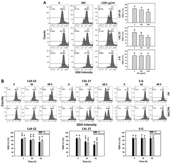 Fucoidan drives GSH depletion in oral cancer cells. (A) GSH flow cytometry density plots and summary histogram analyses. Oral cancer (Ca9-22 and CAL 27) and non-malignant cells (S–G) were treated with fucoidan (control, 800, and 1200 μg/mL) for 0 and 48 h. (+) indicates high levels of GSH. (B) The effect of oxidative stress on the GSH depletion of fucoidan-incubated oral cancer cells. After NAC preincubation or not, cells were treated with fucoidan (1200 μg/mL) with NAC co-treatment (10 mM) for 0, 36, and 48 h. In general, the actual setting for the windows is based on the same GSH intensity of the controls between different cell lines. NAC/fucoidan (NAC/FN) represents the pretreatment with NAC and post-treatment with FN. Data = mean ± SD (n = 3 experiments). Data with non-overlapping letters reveal significant differences (p < 0.05). In the example of Figure 6A (CAL 27 cells), FN at 0, 800, and 1200 μg/mL, labeled with the connecting letters “a, b, and c”, has significant results, because the letters do not overlap. In contrast, in the example of Figure 6A (S–G cells), FN at 0, 800, and 1200 μg/mL labeled with “a” has nonsignificant results because they overlap with “a”.