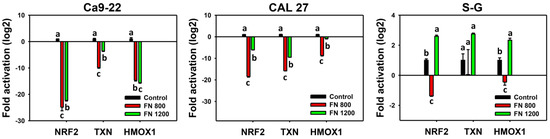 Fucoidan stimulates antioxidant signaling in oral cancer cells. Oral cancer (Ca9-22 and CAL 27) and non-malignant cells (S–G) were treated with fucoidan (control, 800 (FN 800), and 1200 (FN 1200) μg/mL) for 0 and 24 h for qPCR analysis. Data = mean ± SD (n = 3 experiments). Data with non-overlapping letters reveal significant differences (p < 0.05). In the example of Ca9-22 cells (HOMX1 gene), control, FN 800, and FN 1200, labeled with the connecting letters “a, b, and c”, have significant results, because the letters do not overlap.