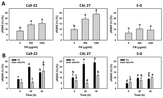 Fucoidan increases the γH2AX level of oral cancer cells. Summary histograms of the flow cytometry results are presented. The individual density plots are presented in Supplementary Figure S3. (A) γH2AX statistical analysis. Oral cancer (Ca9-22 and CAL 27) and non-malignant cells (S–G) were treated with fucoidan (control, 800, and 1200 μg/mL) for 0 and 48 h. (+) indicates a high level of γH2AX. (B) The effect of oxidative stress on the γH2AX increment in fucoidan-incubated oral cancer cells. After NAC preincubation or not, cells were post-treated with fucoidan (1200 μg/mL) with NAC co-treatment (10 mM) for 0, 36, and 48 h. NAC/fucoidan (NAC/FN) represents pretreatment with NAC and post-treatment with FN. Data = mean ± SD (n = 3 experiments). Data with non-overlapping letters reveal significant differences (p < 0.05). In the example of Figure 8B (CAL 27 cells), FN at 0 and 36 h, labeled with the connecting letters “bc and a”, has significant results, because the letters do not overlap. FN and NAC/FN at 36 or 48 h labeled with “a and d” and “a and b” have significant results. In contrast, FN at 36 and 48 h labeled with “a” has nonsignificant results because they overlap with “a”. The positive control of γH2AX is provided in Supplementary Figure S9.