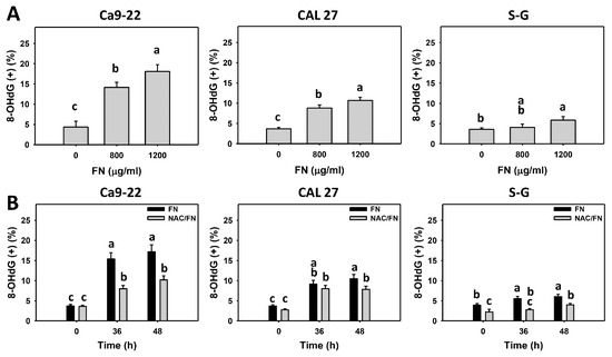 Fucoidan increases the 8-OHdG level of oral cancer cells. Summary histograms of the flow cytometry results are presented. The individual density plots are presented in Supplementary Figure S4. (A) 8-OHdG statistical analysis. Oral cancer (Ca9-22 and CAL 27) and non-malignant cells (S–G) were treated with fucoidan (control, 800, and 1200 μg/mL) for 0 and 48 h. (+) indicates a high level of 8-OHdG. (B) The effect of oxidative stress on the 8-OHdG increment in fucoidan-incubated oral cancer cells. After NAC preincubation or not, cells were treated with fucoidan (1200 μg/mL) with NAC co-treatment (10 mM) for 0, 36, and 48 h. NAC/fucoidan (NAC/FN) represents the pretreatment with NAC and post-treatment with FN. Data = mean ± SD (n = 3 experiments). Data with non-overlapping letters reveal significant differences (p < 0.05). In the example of Figure 9B (Ca9-22 cells), FN at 0 and 36 h, labeled with the connecting letters “c and a”, has significant results, because the letters do not overlap. FN and NAC/FN at 36 or 48 h labeled with “a and b” have significant results. In contrast, FN at 36 and 48 h labeled with “a” has nonsignificant results because they overlap with “a”. The positive control of 8-OHdG is provided in Supplementary Figure S10.