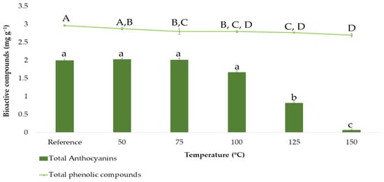 In order to determine the total phenolic compounds and the total anthocyanins based on the BBD design, the ranges corresponding to each factor had to be previously established. Except for that corresponding to the temperature, the rest of the ranges were set according to the group’s previous experience with onion matrices [25]. Since temperatures are higher in microwave-assisted extraction processes than in ultrasound-assisted extraction ones, this variable was studied separately by carrying out a stability study of the extracted bioactive compounds. For that purpose, the following extraction temperatures were studied in triplicate: 50, 75, 100, 125, and 150 °C, while the rest of the factors were set at intermediate constant values (50% methanol:water, 0.2:15 g:mL ratio and 5 min extraction time). The results obtained can be seen in Figure 2.