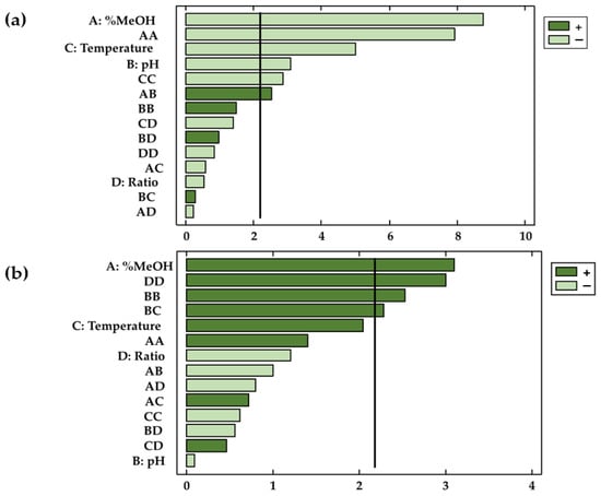 Not only the validity of the models has been confirmed, but this study has also determined the coefficients of the different parameters in the polynomial equation as well as their significance on the dependent variable. The factors and/or interactions that showed p-values < 0.05 were considered relevant (with statistical significance) for the response at a given significance level of 95%. This information was complemented by Pareto diagrams (Figure 3a,b), where the influence of the factors or their interactions can be conveniently visualized.