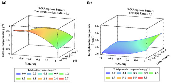 Finally, for both anthocyanins and total phenolic compounds, from Table 2 and Table 3 and the Pareto charts, a number of interactions between factors and their quadratic interactions with a significant influence on the response can be inferred. These trends have been recorded in three-dimensional (3D) surface plots (Figure 4a,b) using the fitted model for a better understanding.