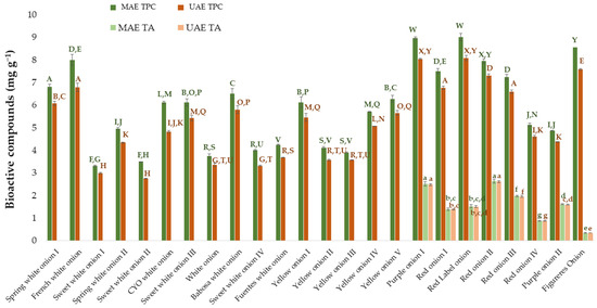 Amount of total phenolic compounds and total anthocyanins extracted by MAE and UAE from different onion varieties. MAE TPC: total phenolic compounds extracted by the optimized MAE method. MAE TA: total anthocyanins extracted by the optimized MAE method. UAE TPC: total phenolic compounds extracted by the optimized UAE method. UAE TA: total anthocyanins extracted by the optimized UAE method. The data in the graph are the mean of 3 replicates ± the standard deviation (expressed as error bars). Different letters mean statistically significant differences according to Tukey’s test at the 95% level of significance.